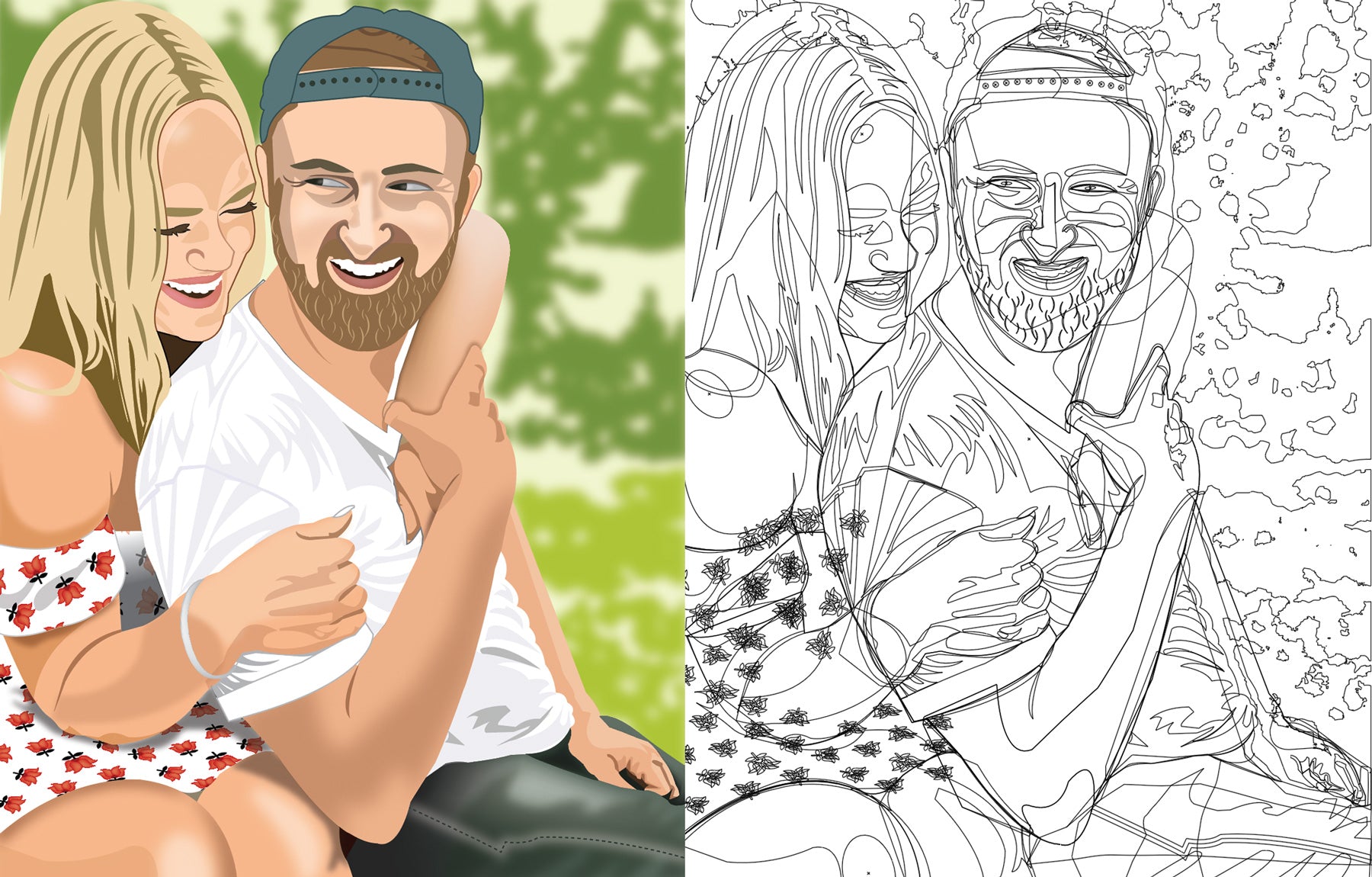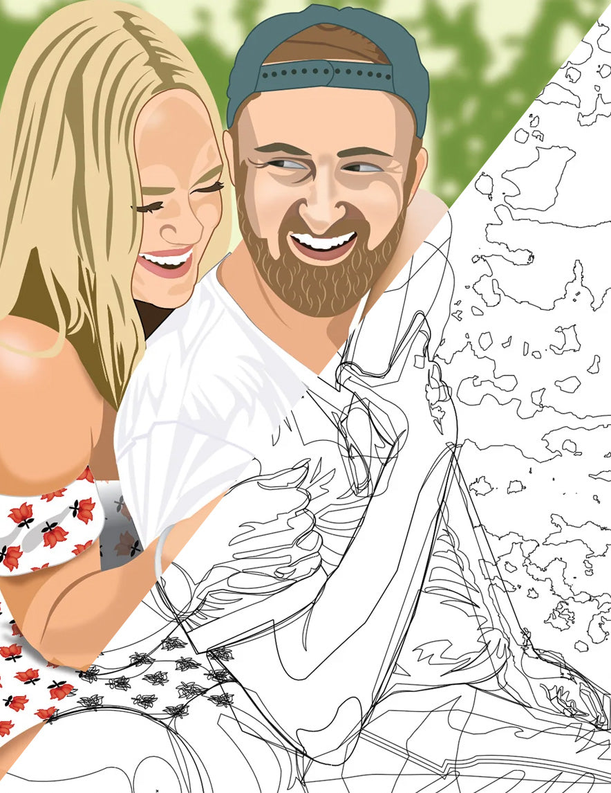 Every line is electronically drawn by hand. Once lines are drawn, each line is filled with color individually. Lines must be adjusted to meet up perfectly. Attention to detail is very important in this kind of vector illustration.